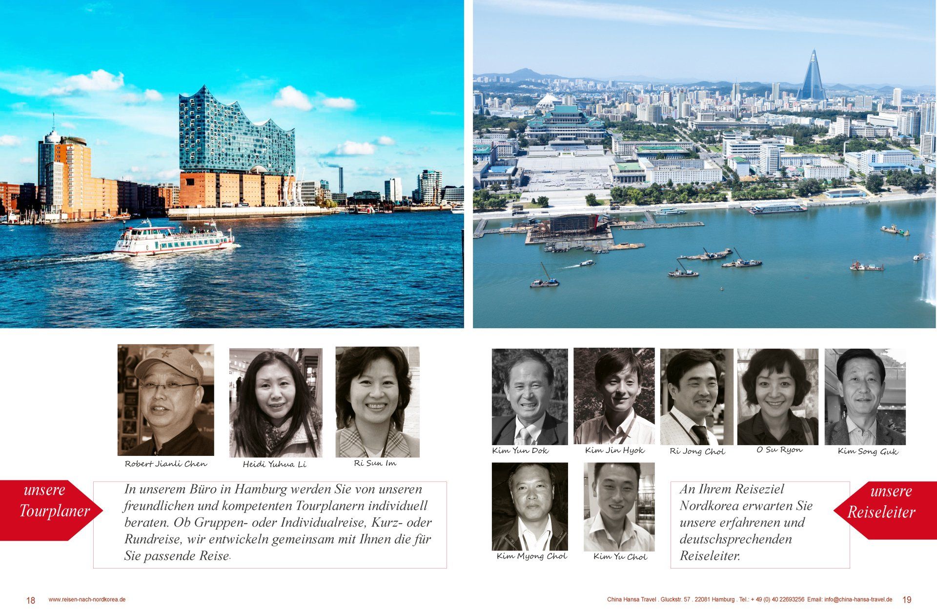 In unserem Büro in Hamburg werden Sie von unseren freundlichen und kompetenten Tourplanern individuell beraten. Ob Gruppen- oder Individualreise, Kurz- oder Rundreise, wir entwickeln gemeinsam mit Ihnen die für Sie passende Reise. In China haben wir logistische Unterstützung durch unsere chinesische Agentur. In Ihrem Reiseziel Nordkorea erwarten Sie unsere qualifizierten, deutschsprachigen Reiseleiter.
