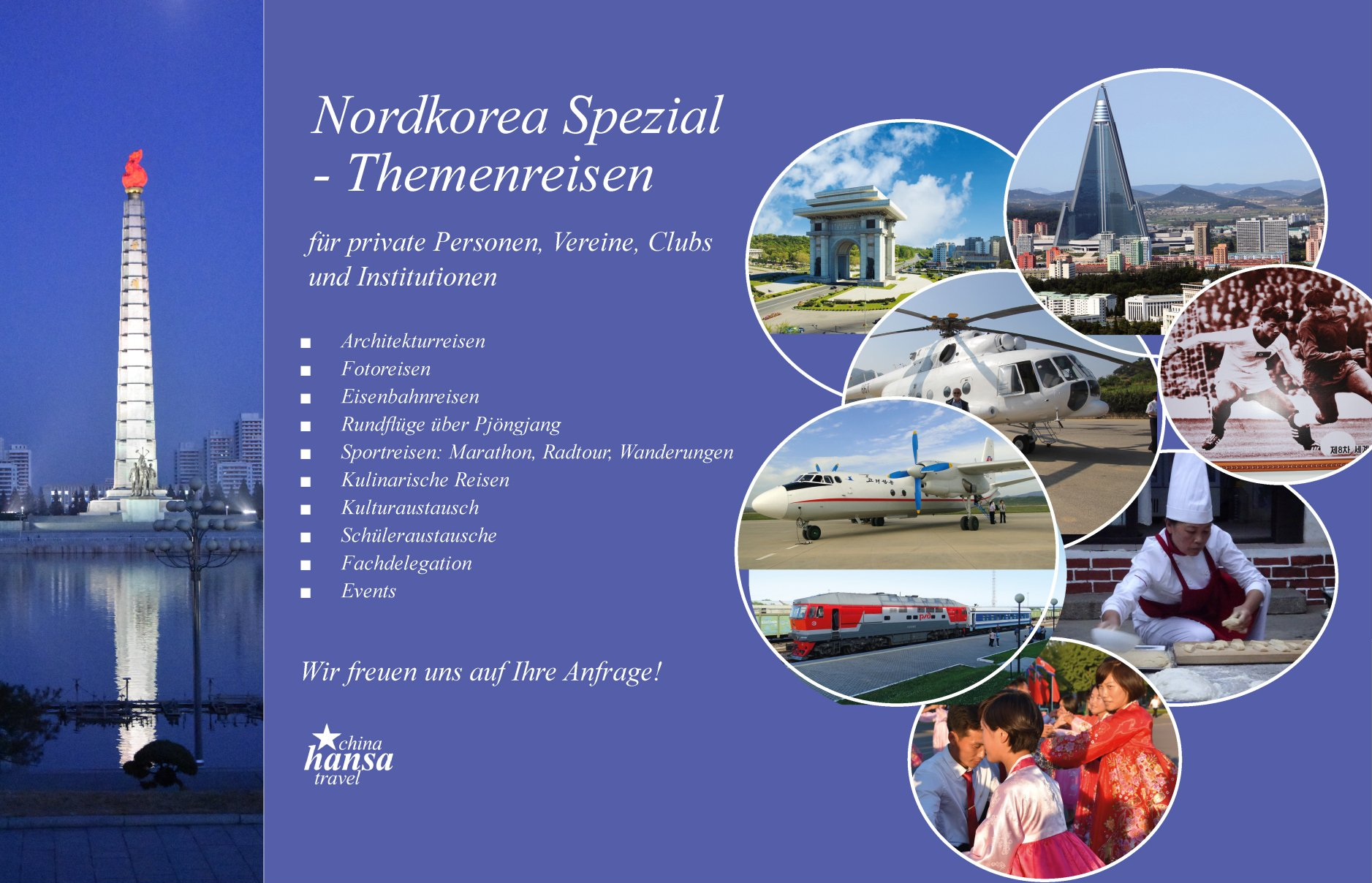 Persönliche Beratung, Beschaffung des erforderlichen Nordkorea-Visums, Flug ab Deutschland, deutschsprachige Reiseleitung auf den vielfältigen Nordkorea-Rundreisen, individuellen Nordkorea-Privatreisen und den zahlreichen Nordkorea-Gruppenreisen sind die überzeugenden Leistungen Ihres Reiseveranstalters China Hansa Travel.